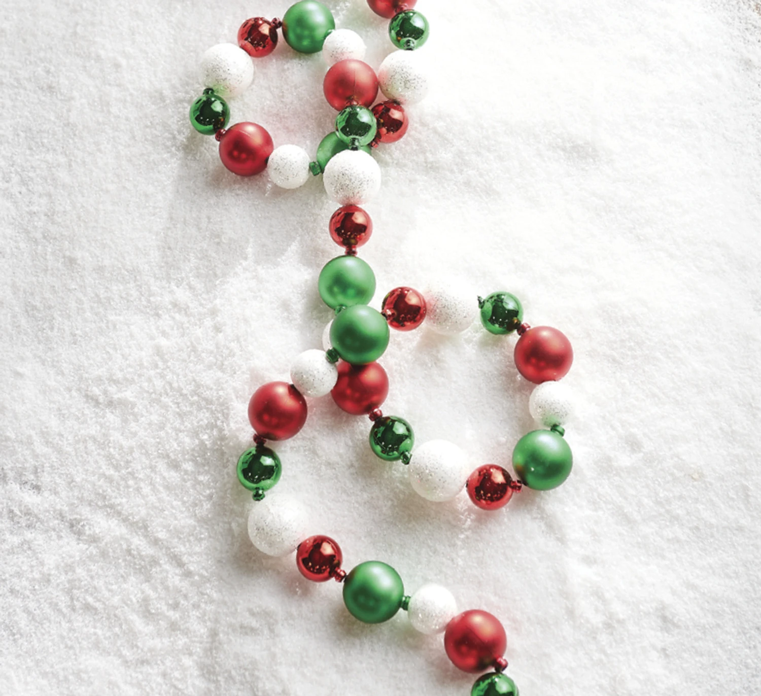 Trim your tree to perfection! This garland features red and green metallic ball ornaments with white glitter ball ornaments in between! Made by Raz Imports. Made of plastic. Dimensions: 6′. Item #: G4206802Â